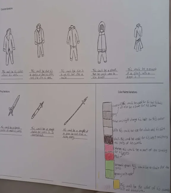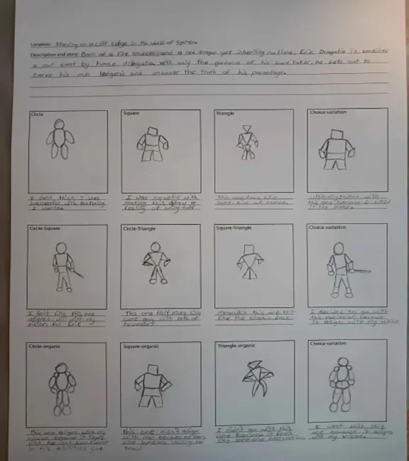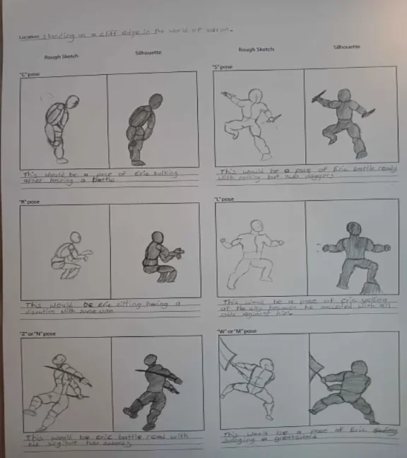 These sketches were created to explore pose ideas for Eric and to help determine the type of weapon he would wield within his world.