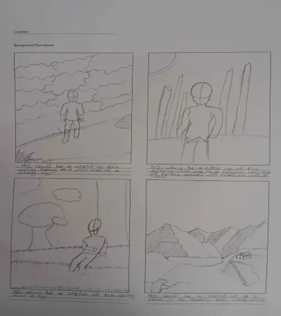 Next came these environmental sketches, which helped me map out the landscape for Eric’s world and decide where I wanted him to stand and focus within the scene.