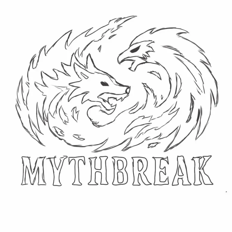 This is the black and white logo variantion for mythbreak that emphasizes the logo's raw design structure and its bold silhouette. This version ensures the mark remains recognizable and striking across monochrome, print, or simplified applications.