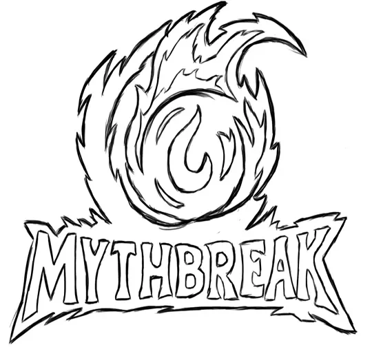 This early concept focuses on the foundational line work of the Mythbreak logo. The flame crest and shadowed swirl are expressed through bold, hand drawn strokes that emphasize movement and energy.