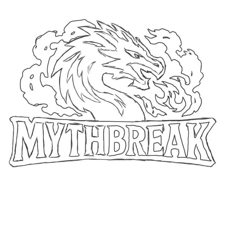 This early concept highlights the foundational line work of the Mythbreak logo, featuring a dragon rising from behind the type, surrounded by swirling smoke as it exhales a small plume of flame.